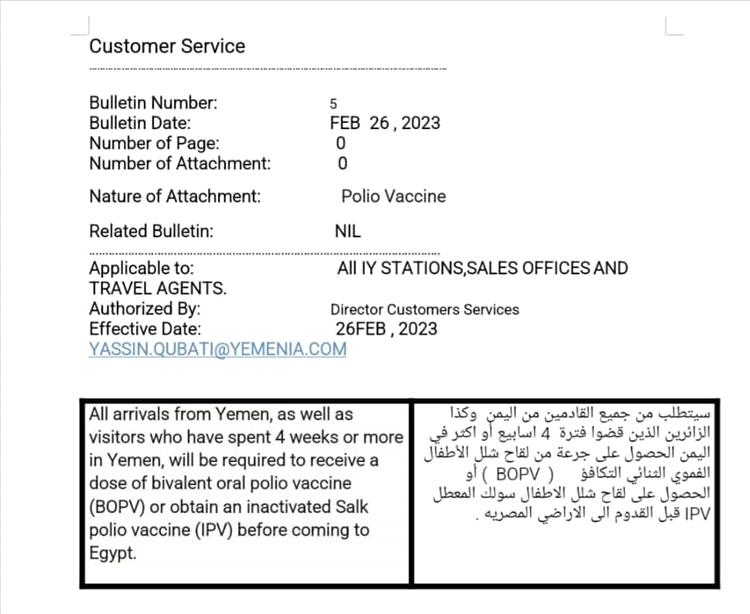 نظرا لكثرة التساؤلات بشأن تعميم السلطات المصرية بخصوص جرعة لقاح شلل الأطفال.. تؤكد الخطوط الجوية اليمنية، أن اللقاح اختياري لجميع الفئات العمرية من المسافرين اليمنيين.