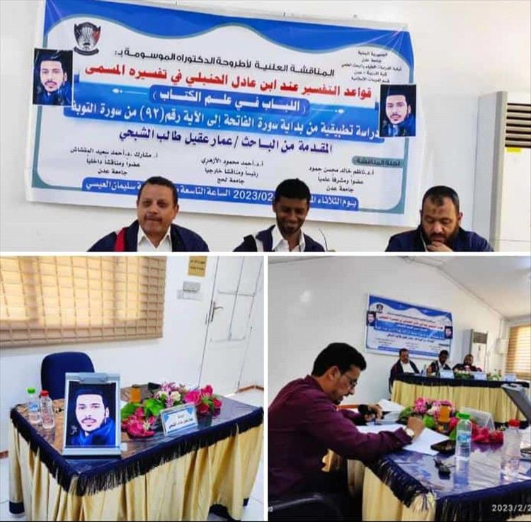 نال الشهيد الباحث عمار عقيل طالب الشبحي، درجة الدكتوراه من قسم الدراسات الاسلامية في كلية التربية عدن - جامعة عدن، اليوم الثلاثاء، بعد مناقشتها بحضور إحدى زملائه بديلاً عنه.