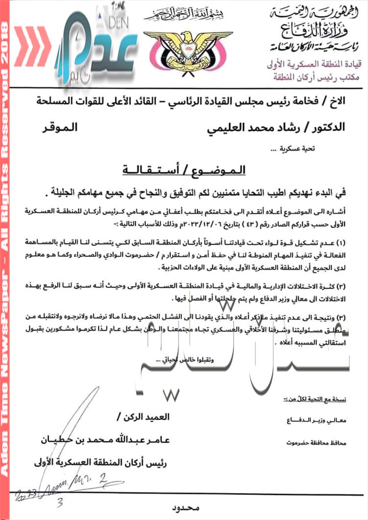 قدم رئيس أركان المنطقة العسكرية الأولى بوادي حضرموت العميد الركن/ عامر بن حطيان النهدي استقالته لرئيس مجلس القيادة الرئاسي، وذلك نتيجة المضايقات من قبل قيادة المنطقة التي قال إنه نخضع للولاء الحزبي.