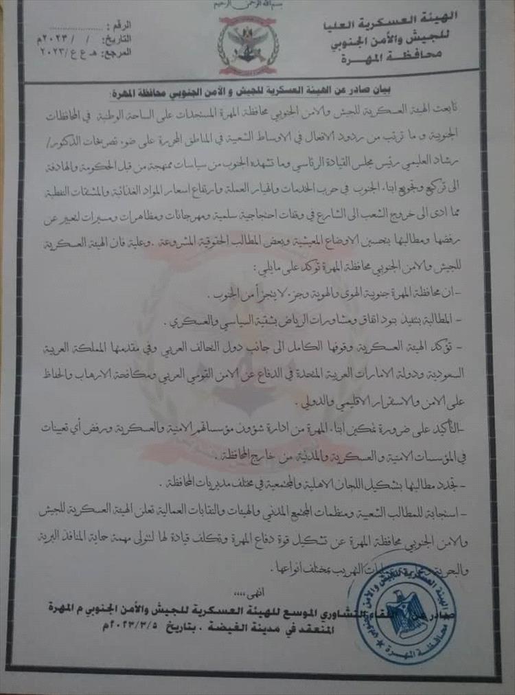 صادر عن اللقاء التشاوري الموسع للهيئة العسكرية للجيش والأمن الجنوبي محافظة المهرة
