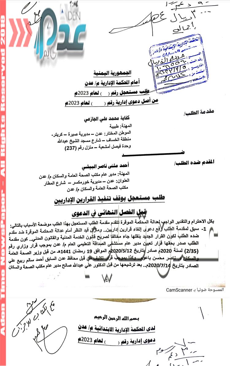 علمت عدن تايم ان المحكمة الادارية في عدن وجهت إستدعاء لمدير عام مكتب الصحة العامة والسكان في العاصمة عدن بالحضور الى المحكمة يوم الاثنين القادم ١٣ مارس ٢٠٢٣م.