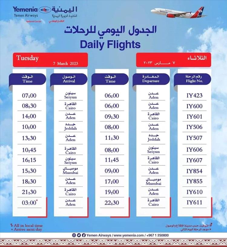 جدول مواعيد اقلاع رحلات طيران اليمنية ليوم غد الثلاثاء كالتالي: