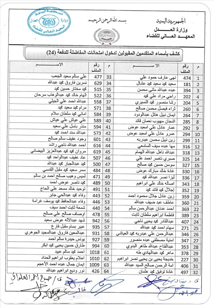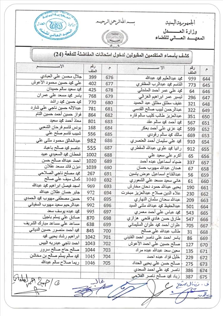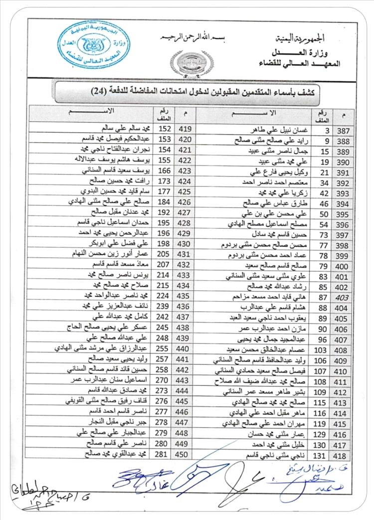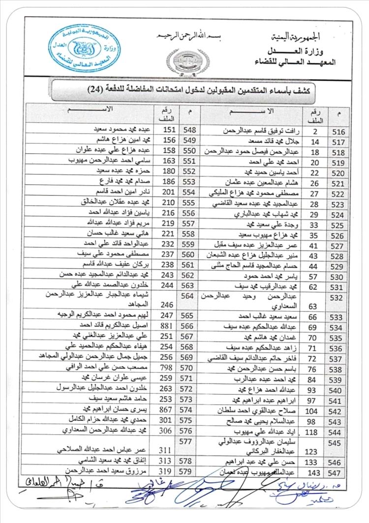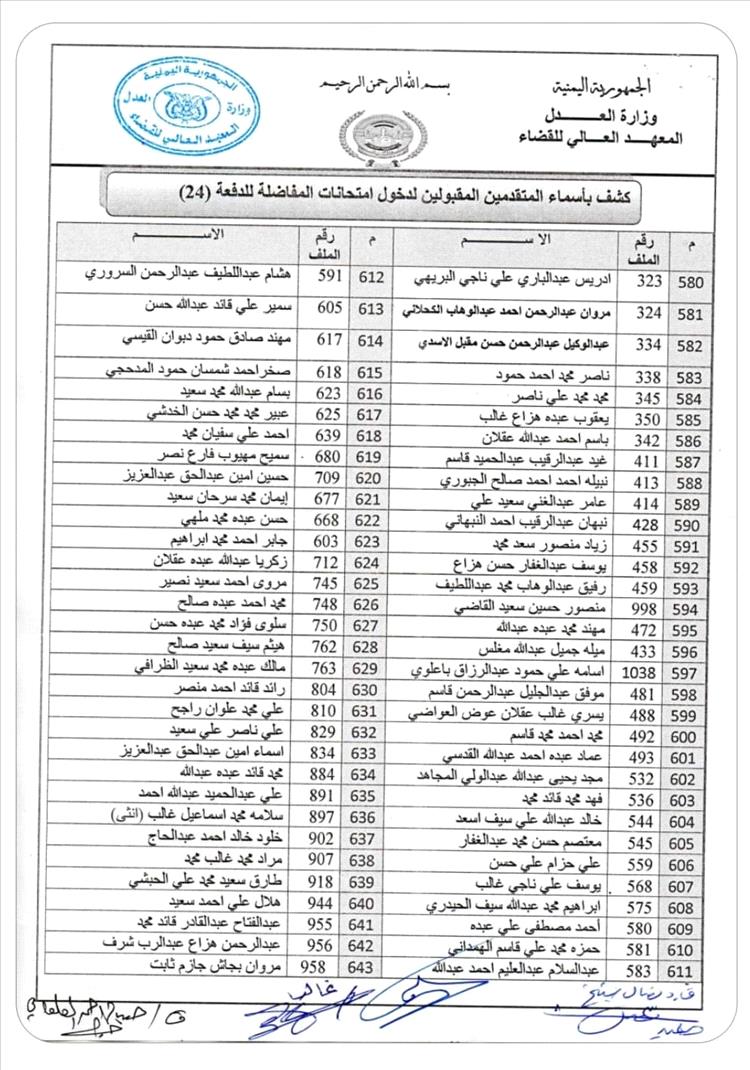بناء على موافقة مجلس المعهد العالي للقضاء، تعلن اللجنة العليا للقبول بالمعهد بأنه قد تقرر اجراء الامتحانات التحريرية للمتقدمين المقبولين للمفاضلة على مقاعد الدفعة (24) دراسات تخصصية عليا خلال الفترة من 15 مارس حتى21 مارس 2023م بمبنى كلية الحقوق جامعة عدن، ونرفق ادناه اسماء المقبولين للمفاضلة كالآتي :