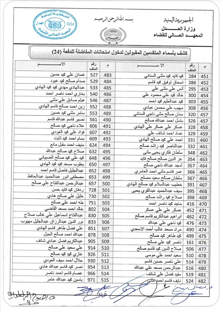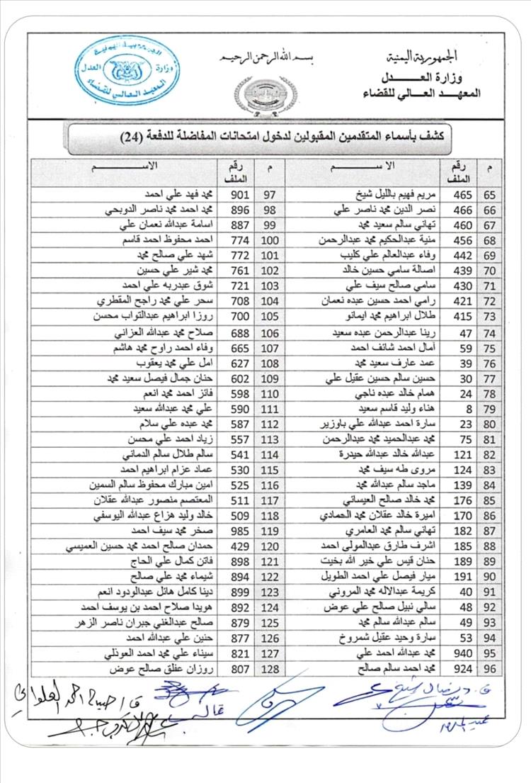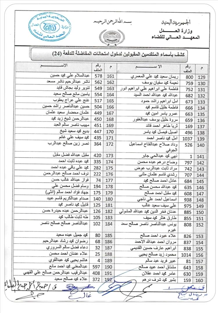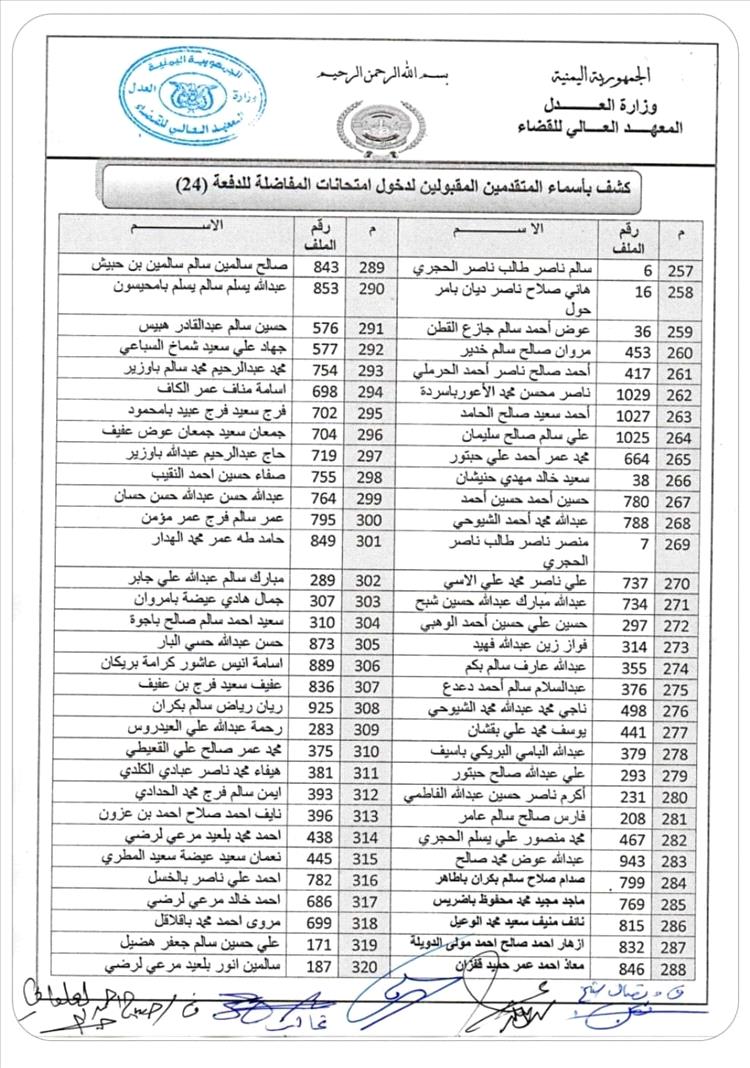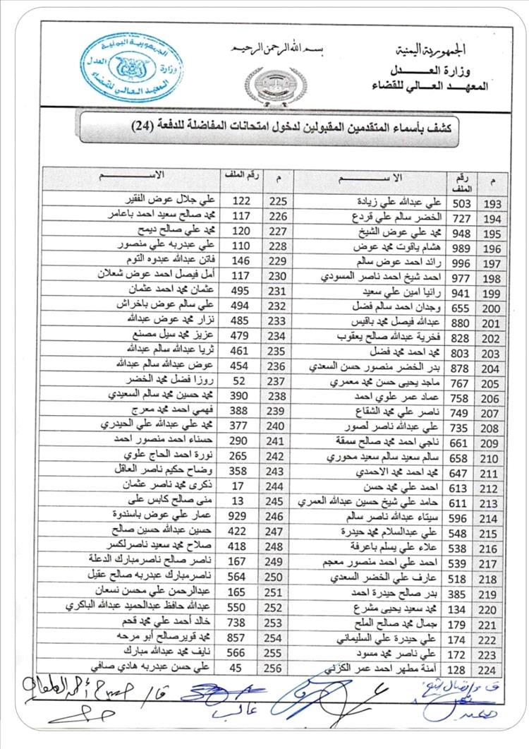 بناء على موافقة مجلس المعهد العالي للقضاء، تعلن اللجنة العليا للقبول بالمعهد بأنه قد تقرر اجراء الامتحانات التحريرية للمتقدمين المقبولين للمفاضلة على مقاعد الدفعة (24) دراسات تخصصية عليا خلال الفترة من 15 مارس حتى21 مارس 2023م بمبنى كلية الحقوق جامعة عدن، ونرفق ادناه اسماء المقبولين للمفاضلة كالآتي :