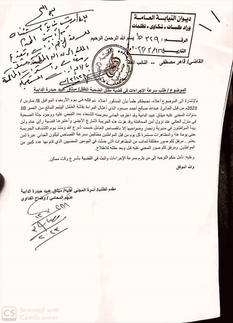 وثيقة - أول توجيه من النائب العام بشأن قضية مقتل الطفل ميثاق بأبين