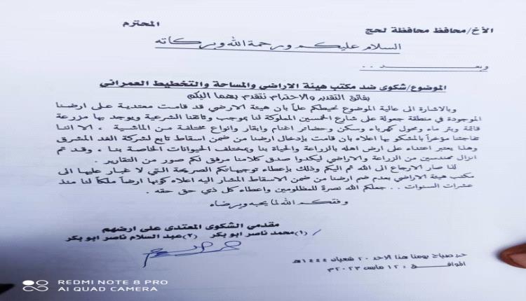 تقدم الاخوين محمد ناصر ابوبكر وعبدالسلام ناصر ابوبكر بشكوى إلى محافظ محافظة لحج ضد هيئة الأراضي بلحج .