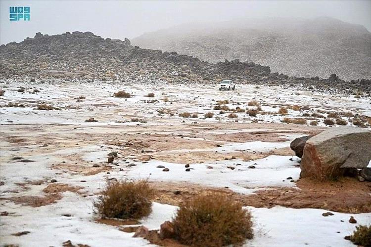 وأظهرت الصور التي نشرتها وكالة الأنباء السعودية واس ثلوج وهي تغطي عدد من الجبال والمرتفعات.
