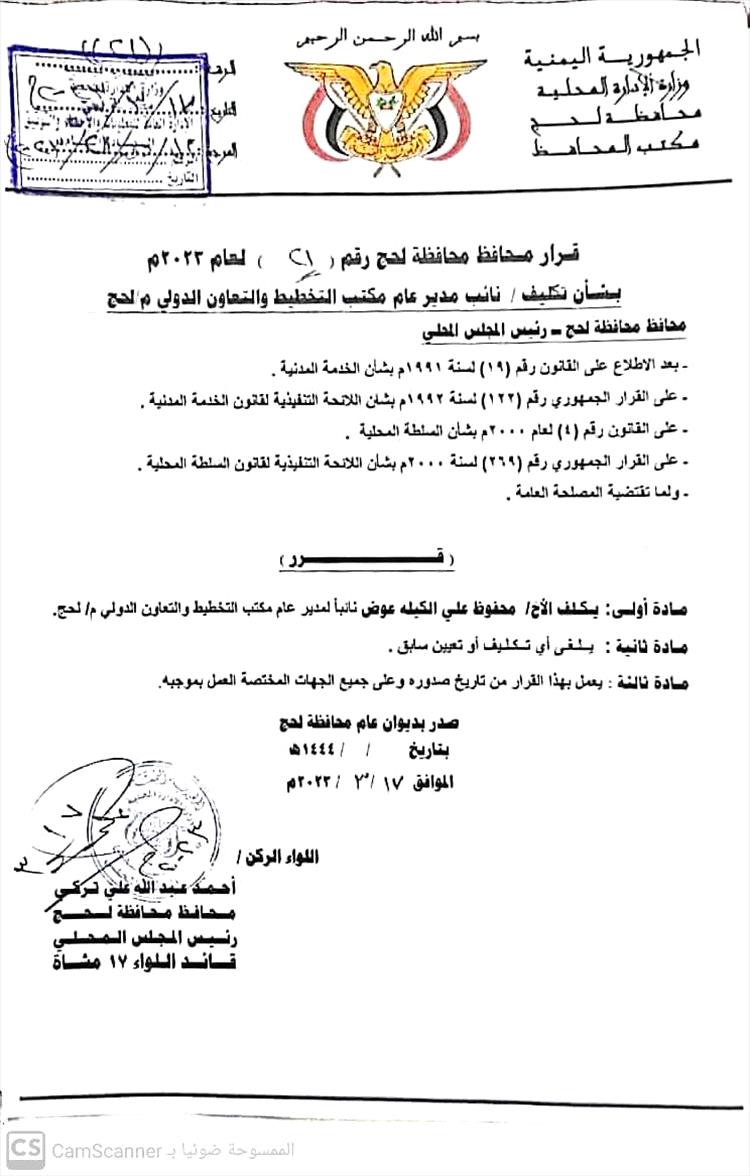أصدر اللواء الركن احمد عبدالله تركي محافظ محافظة لحج قائد اللواء ١٧ مشاة قرارا قضى في مادته الاولى بتكليف الاستاذ الاستشاري محفوظ علي الكيله عوض نائباً لمدير عام مكتب التخطيط والتعاون الدولي بالمحافظة.