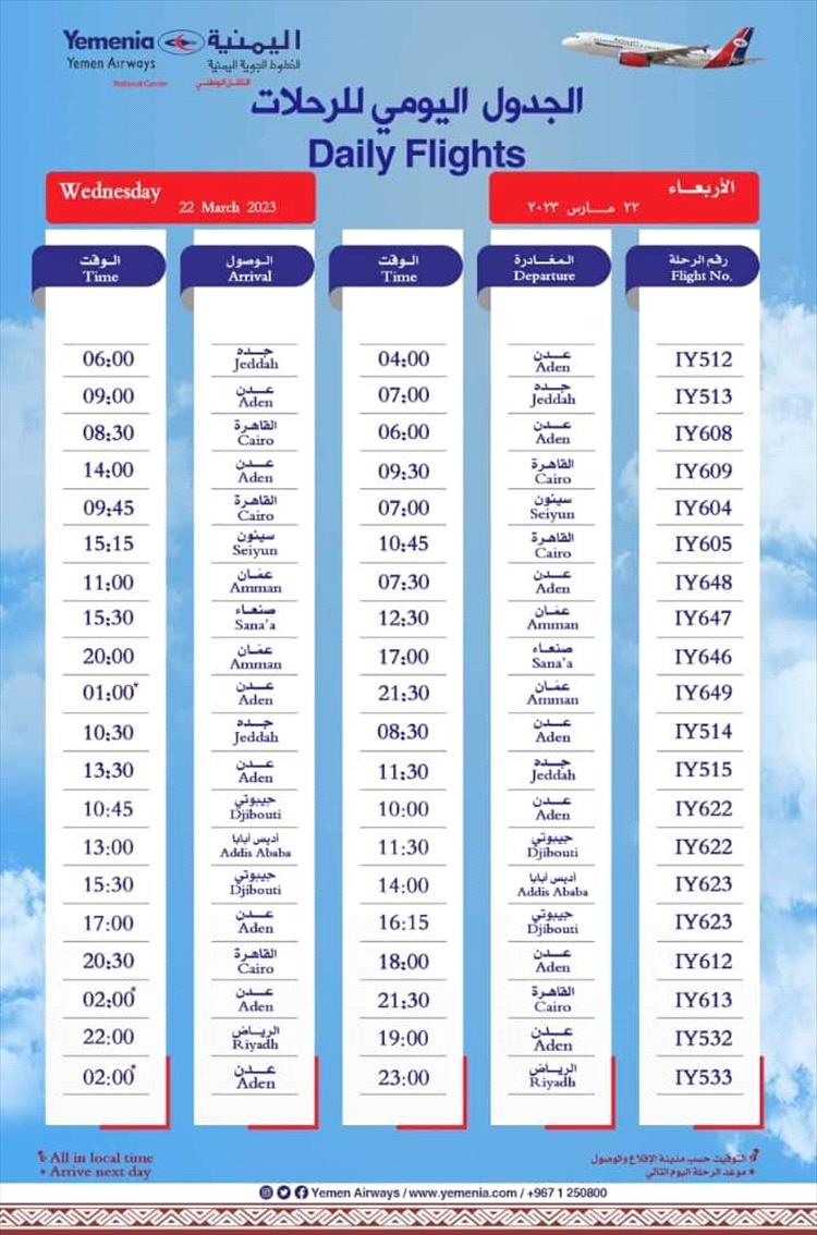 جدول مواعيد اقلاع رحلات طيران اليمنيه ليوم غد الاربعاء الموافق٢٢/٣/٢٠٢٣ كالتالي: