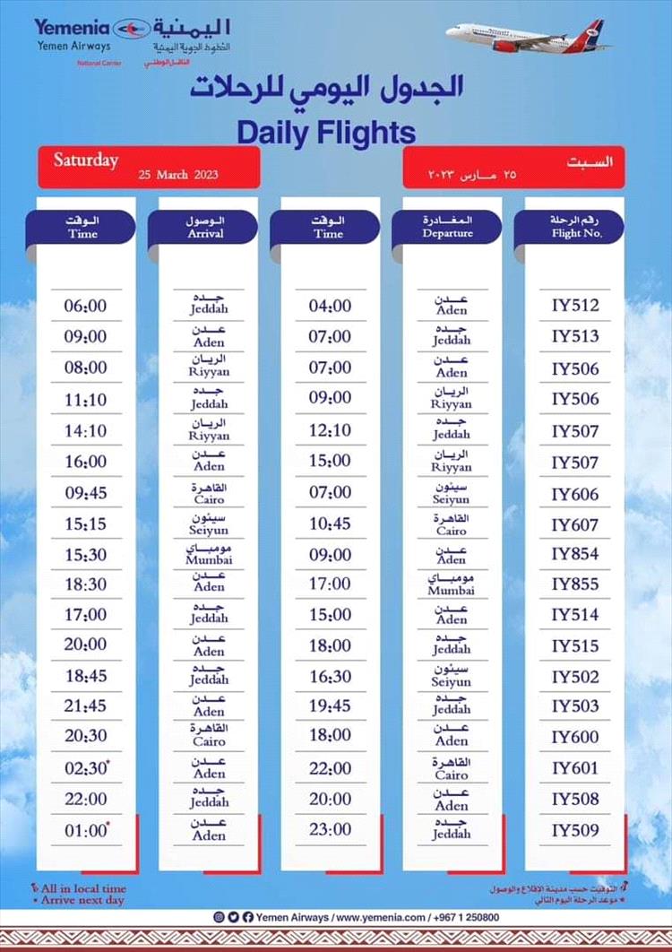 جدول رحلات اقلاع اليمنية لليوم السبت كالتالي: