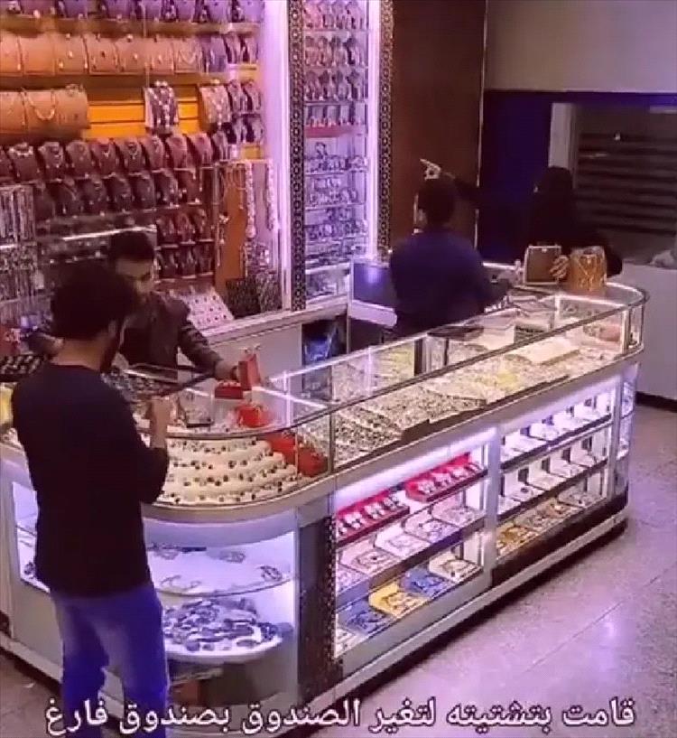 وأبان المقطع، المرأة وهي تطلب من البائع أن يستعرض لها بعض القطع الذهبية الأخرى بهدف تشتيته، وفي أثناء ذلك، أدخلت المنتقبة العلبة التي بها حزام الذهب داخل حقيبتها وأخرجت علبة أخرى مشابهة، دون أن ينتبه البائع.