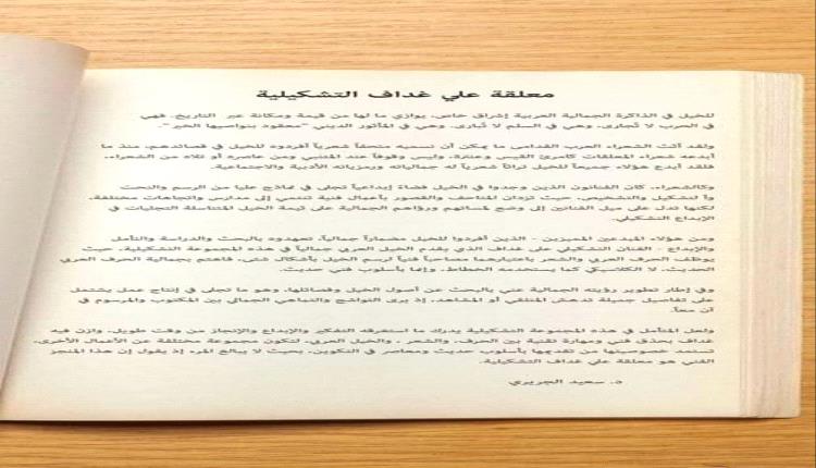 غير أن زمن كوفيد لم يكن رؤوفاً به فقد اختطف رفيقة دربه، ليسلمه بعد ذلك لانتكاسة صحية ونفسية. ولقد حاولنا معاً أن نستأنف ما بدأ، فكان إعداد كاتلوج مجموعة لوحات الراحلة التي استلهمت فيها مقامات الواسطي برؤية معاصرة، ذات فضاء حواري مع المقامات والفن الإسلامي. وقد شرفت بأن كتبت كلمة تقديم لتلك المجموعة المدهشة. ثم شرفني الأستاذ غداف مرة أخرى بأن كتبت كلمة تقديم أبهجته كثيراً فوضعها فاتحة لمجموعته التشكيلية عن الحرف والخيل والشعر العربي، لم أبالغ إذ جعلت عنوانها "معلقة علي غداف التشكيلية"، فهذا هو الحد الأدنى في وصف مجموعة عميقة عليها بصمته الإبداعية.