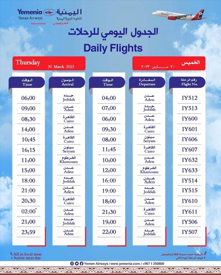 جدول مواعيد اقلاع رحلات طيران اليمنية ليوم الخميس الموافق30/3/2023م
