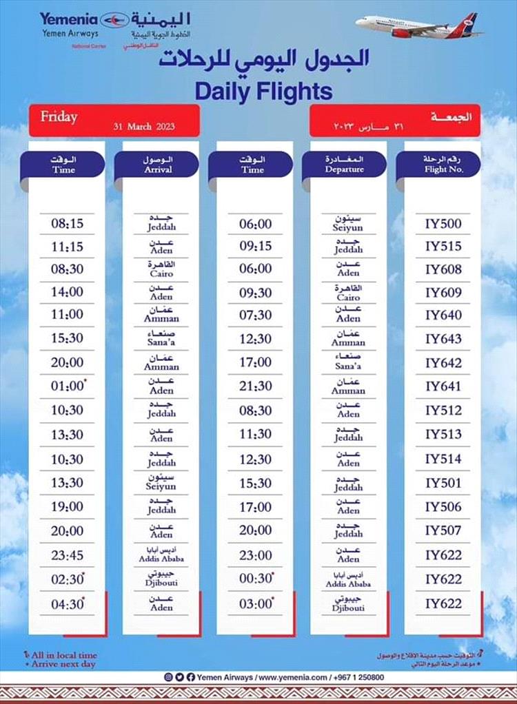 جدول مواعيد اقلاع رحلات اليمنية لليوم الجمعة كالتالي: