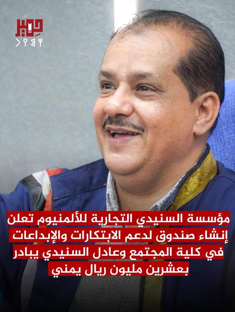 ومثل هذا الموقف ليس بغريب على ابن السنيدي فهو صاحب أيادٍ بيضاء ومواقف محمودة في فعل الخير وفي دعم المشاريع الخيرية وتشجيع المبدعين، وهو ما تتحدث عنه مواقفه التي نجد بصماتها في أكثر من مجال، لا سيما في الطرقات وفي التربية والتعليم، ويكفي أن نشير إلى إعلانه في حفل التكريم عن دعم مؤسسته (مؤسسة السنيدي التجارية للألمنيوم) عن إنشاء صندوق لدعم الابتكارات والإبداعات في كلية المجتمع ويبادر بتقديم عشرين مليون ريال يمني لصالح ذلك الصندوق الذي من شأنه دعم الإبتكارات العلمية والإبداعية.. ولا شك أنه يمثل أسوة حسنة لرجال المال والأعمال الذين يرتبطون بقضايا مجتمعهم ويدعمون بسخاء في كثير من مجالات الخير، وجعل الله ما يقدمونه في ميزان حسانتهم ولأمثاله ترفع القبعات.