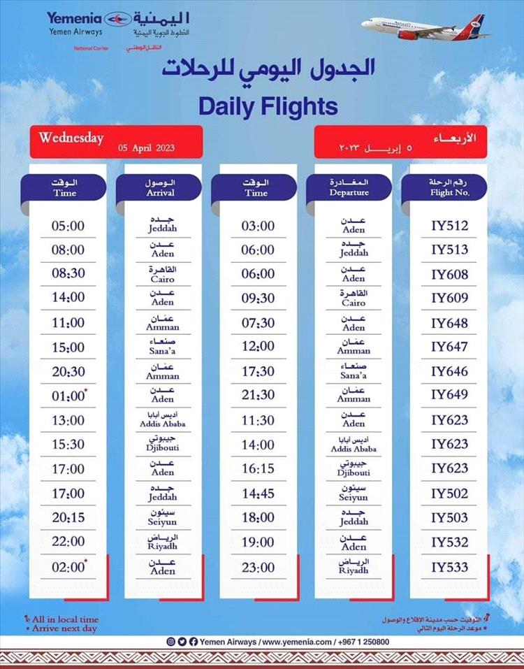 جدول مواعيد اقلاع الرحلات لليوم الاربعاء كالتالي: