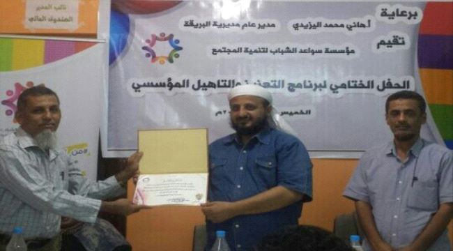 نظمت مؤسسة سواعد الشباب لتنمية المجتمع بمديرية البريقة محافظة عدن، حفل اختتام برنامج التعزيز والتأهيل المؤسسي.