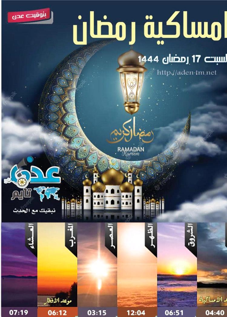 توقيت الامساكية والأفطار وأوقات الصلاة في العاصمة عدن 17رمضان