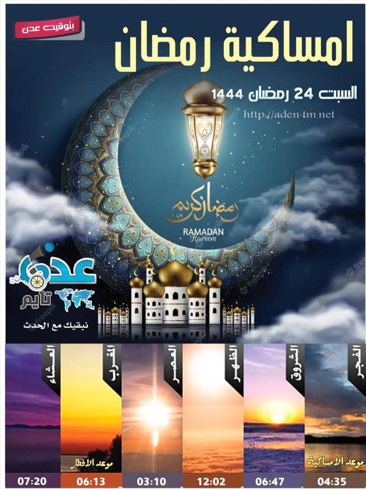 تعرف على توقيت الامساكية والأفطار وأوقات الصلاة في العاصمة عدن 24رمضان