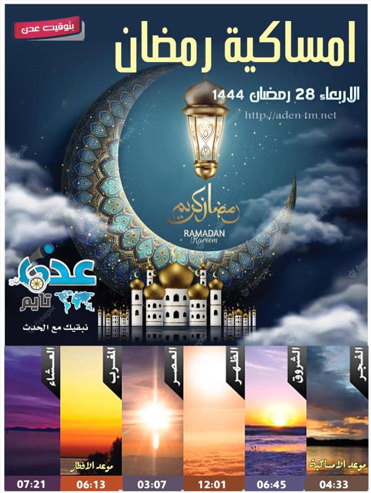 تعرف على توقيت الامساكية والأفطار وأوقات الصلاة في العاصمة عدن 28رمضان