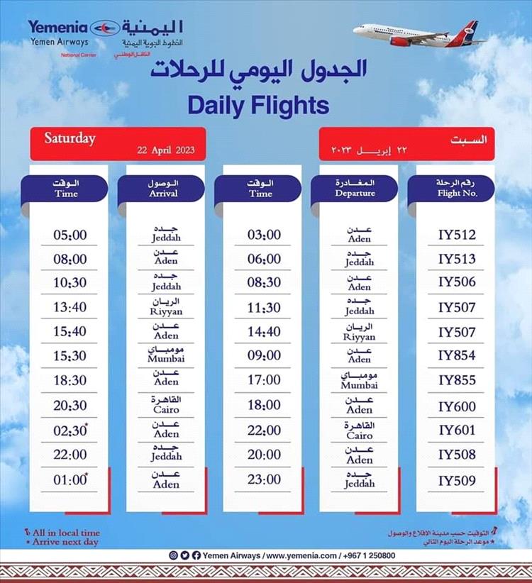 جدول اقلاع رحلات اليمنية لليوم السبت كالتالي: