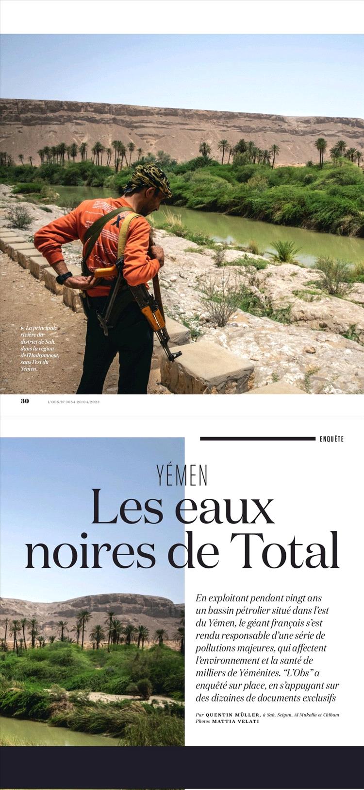 في مادة هي الأولى من نوعها وصفت بأنها " تقرير هام جداً "، أعد الصحفي كانتان ميُلر في مجلة لاوبس الفرنسية تقرير من عشر صفحات عن تبعات التلوث البيئي لشركة توتال النفطية الفرنسية في #حضرموت وتحديدا مديرية ساه.