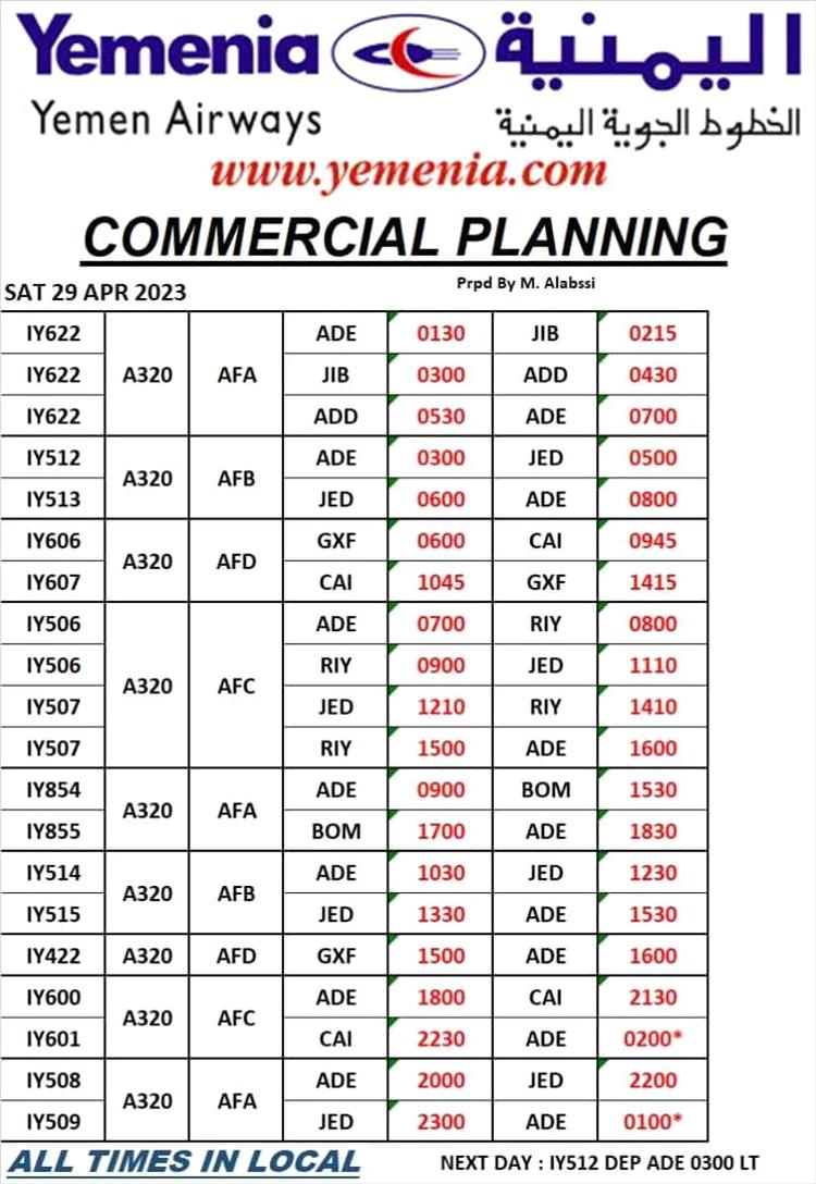 جدول مواعيد اقلاع رحلات طيران اليمنية ليوم غد السبت الموافق29ابريل