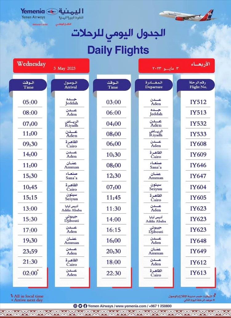 جدول مواعيد اقلاع رحلات طيران اليمنية الموافق 3مايو2023م