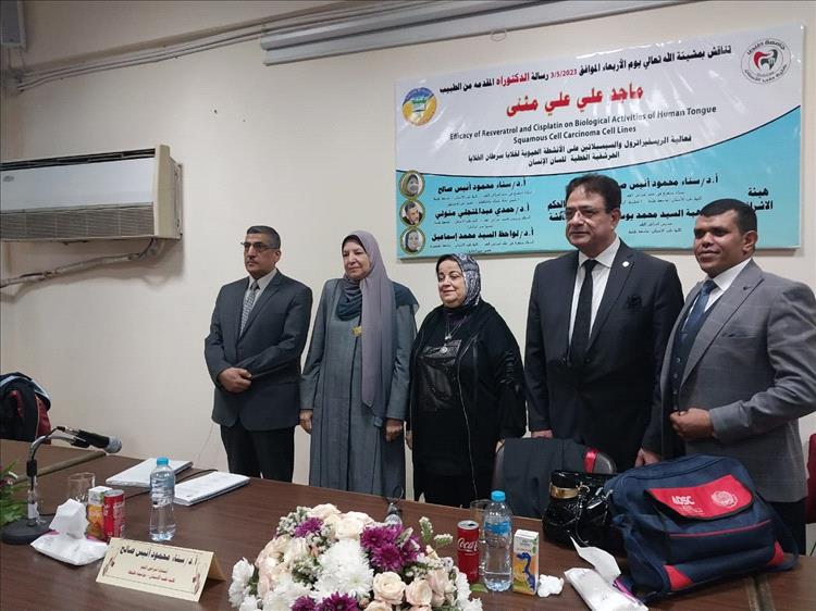 تمت اليوم في رحاب كلية طب الاسنان بجامعة طنطا بجمهورية مصر العربية، المناقشة العلنية لرسالة الدكتوراة المقدمة من الباحث الطبيب ماجد علي علي الحالمي، والموسومة ب"فعالية الريسيفراترول والسيسبلاتين على الأنشطة الحيوية لخلايا سرطان الخلايا الحرشفية الخطية للسان الانسان".