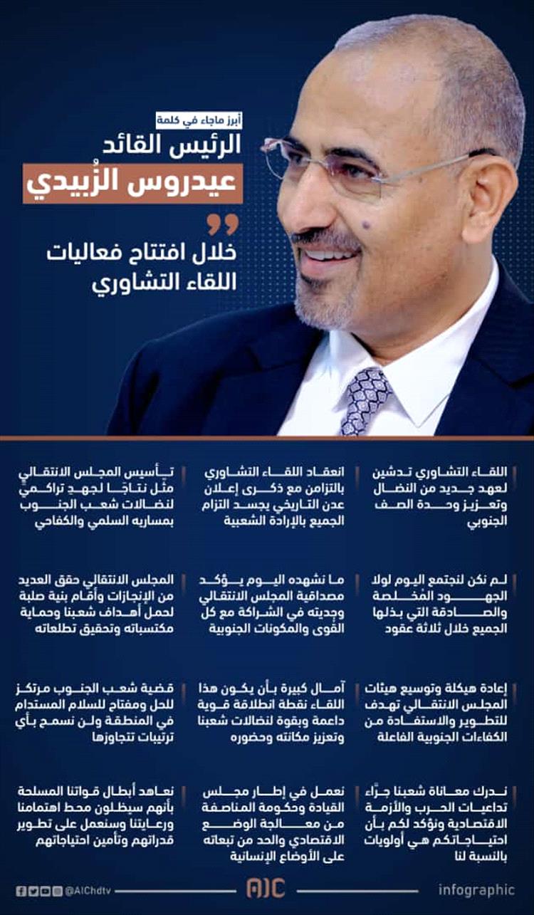 أنفوجرافيك..أبرز ما ورد في كلمة الرئيس القائد عيدروس الزبيدي في اللقاء التشاوري الجنوبي