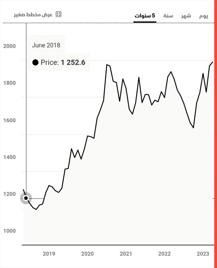 وكما يظهر في المخطط الذي تعرضه لكم عدن تايم فإن الذهب منذ 5 أعوام يحافظ على ثباته أو صعوده حيث يبدأ المخطط التالي من يونيو عام 2018 الى ابريل 2023