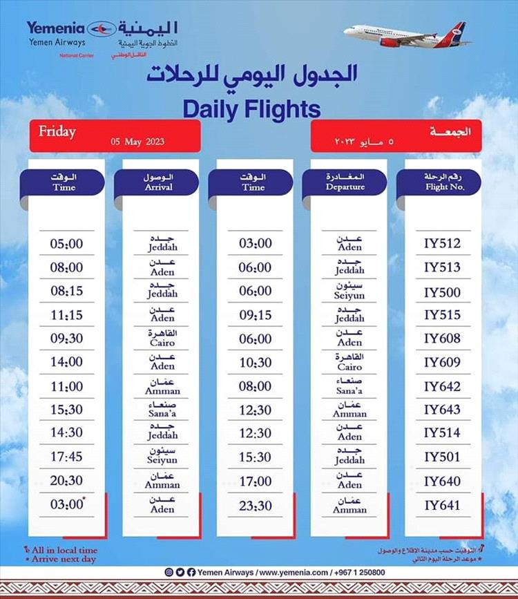 جدول مواعيد اقلاع رحلات طيران اليمنية لليوم الجمعة الموافق 5 مايو