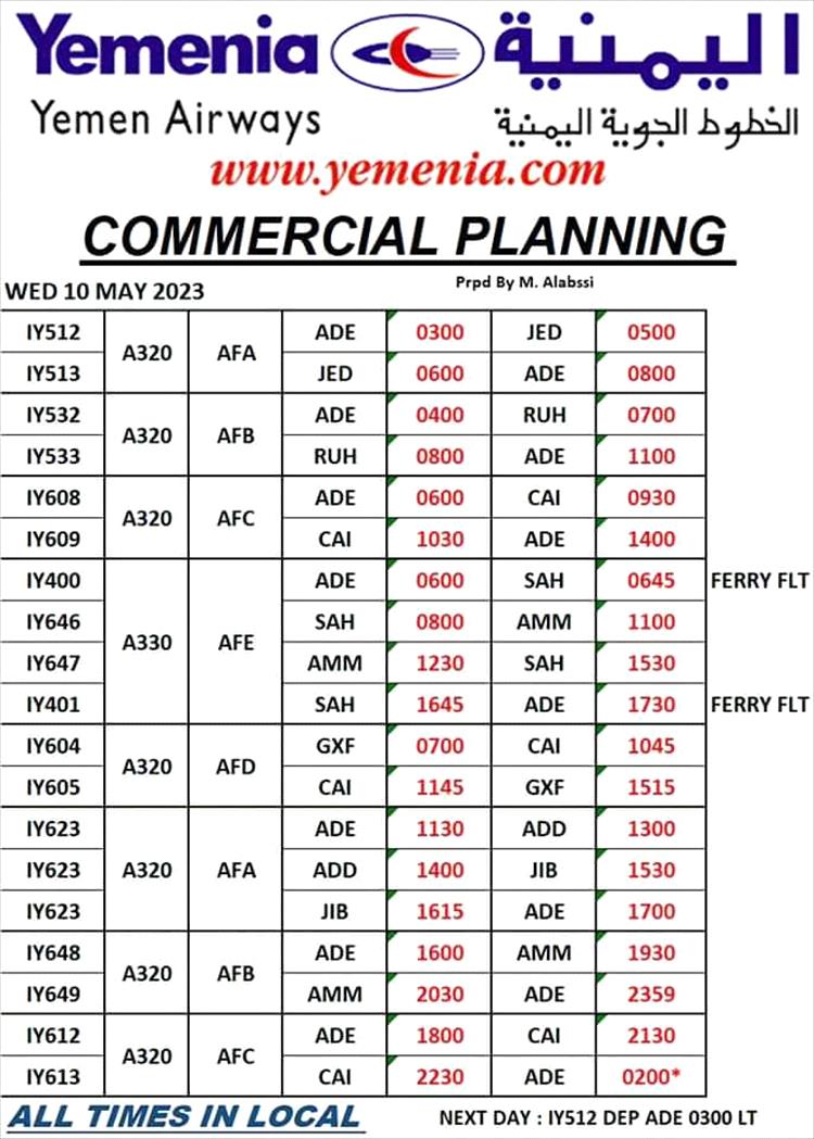 جدول مواعيد اقلاع رحلات طيران اليمنية ليوم غد الاربعاء كالتالي: