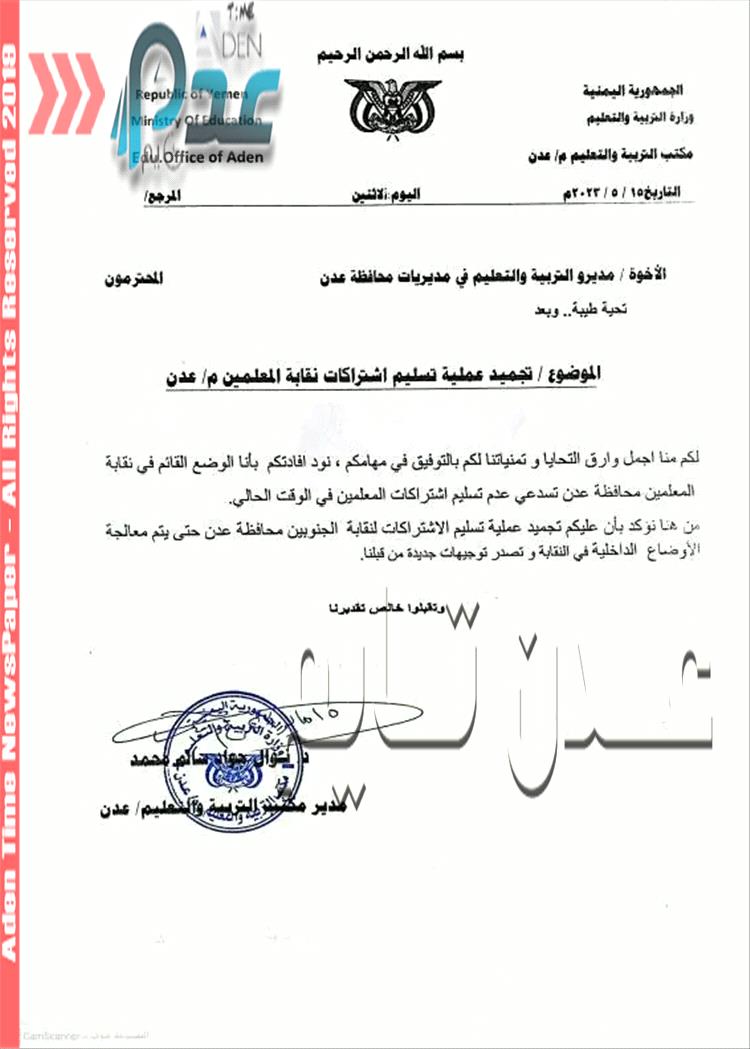 تجميد مساهمات المعلمين والتربويين الشهرية لنقابة المعلمين والتربويين الجنوبيين"وثيقة"