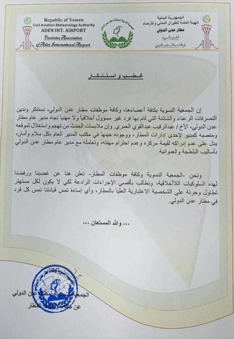 وثيقة- الجمعية النسوية لموظفات مطار عدن تستنكر الاعتداء على المدير العام "العمري"