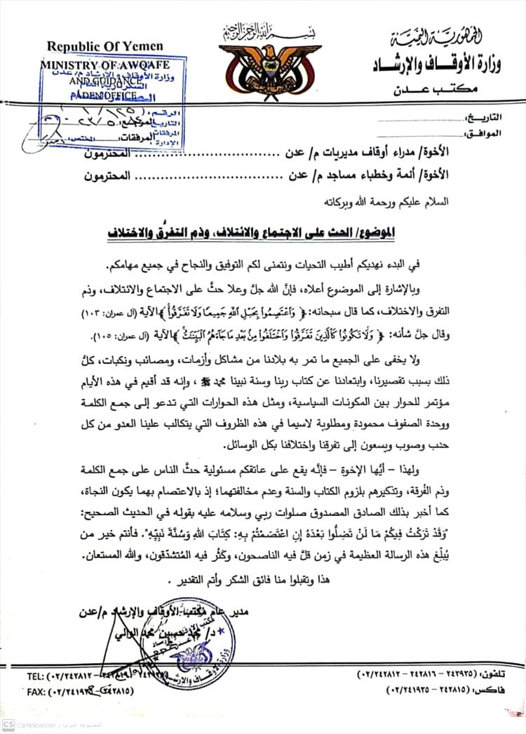 أصدر مكتب الأوقاف والإرشاد العاصمة عدن تعميما للأئمة والخطباء