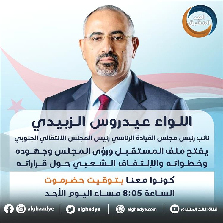 من القصر الرئاسي بمديرية المكلا عاصمة محافظة حضرموت سيطل الرئيس القائد عيدروس بن قاسم الزُبيدي رئيس المجلس الإنتقالي الجنوبي، نائب رئيس مجلس القيادة الرئاسي في #لقاء_خاص مساء اليوم الأحد في "ذكرى فك الارتباط 1994م".