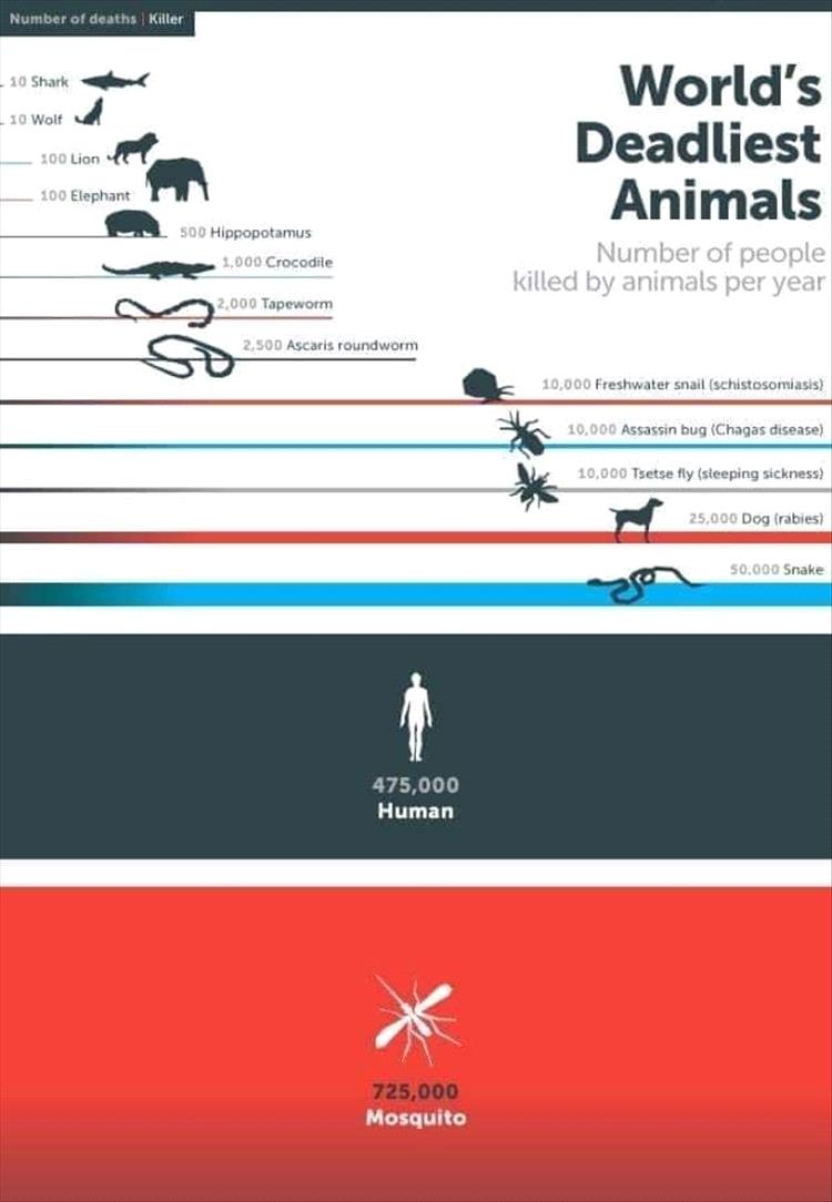 ودراسات عدة أكدت أن البعوض يقتل فى السنة الواحدة 725000 انسان وهذا عن طريق نقل الأمراض المميتة بين البشر بسرعة فائقة، المرتبة الثانية هى الانسان ويقتل متوسط 475000 بشري خلال المعارك والحروب والاشتباكات.