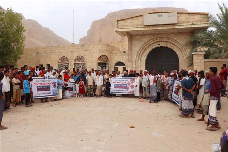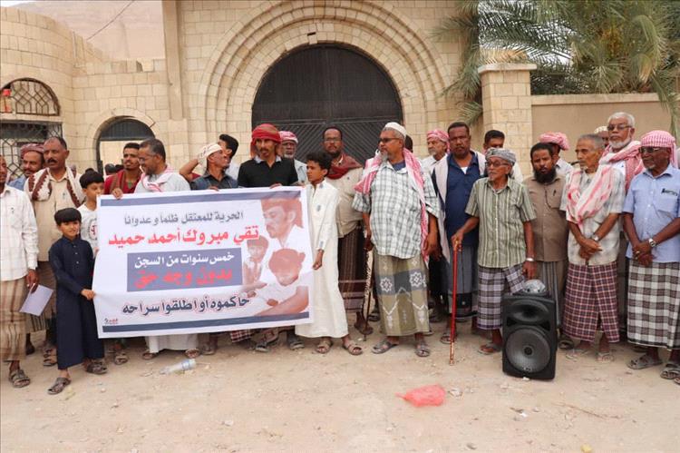 وتجمع المشاركين في الوقفة الاحتجاجية أمام المحكمة الإبتدائية بالمديرية، حاملين عدة لافتات بها شعارات تنادي برفع الظلم والقهر عن المساجين *( تقي مبروك أحمد حميد ، وماهر صالح عبود باشماخ ، ومحمد سالم عمر محيور ، والمخفي قسراً فيصل صالح علي باشماخ)* واكدوا على ضرورة إجراء محاكمات عادلة لهم، وعدم الإبقاء عليهم في السجن دون محاكمة والكشف عن المخفي قسراً.