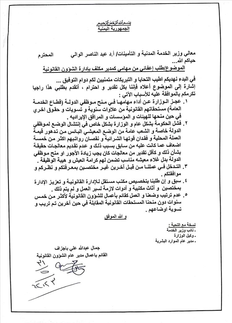 وكان جمال عبدالله علي باجزاف القائم بأعمال مدير عام الشؤون القانونية بوزارة الخدمة المدنية والتأمينات قد قدم طلبا الخميس باعفاءه من منصبه .