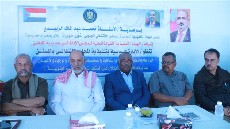 نظمت الادارة السياسية بالهيئة التنفيذية للقيادة المحلية للمجلس الانتقالي الجنوبي بمديرية القطن برعاية الاستاذ/ محمد عبدالملك الزبيدي رئيس الهيئة التنفيذية المساعدة للمجلس الانتقالي الجنوبي لشؤون مديريات وادي وصحراء حضرموت واشراف الهيئة التنفيذية لانتقالي القطن نظمت اليوم السبت ندوة سياسية للنخب السياسية والثقافية والشخصيات الاجتماعية والوجهاء والأعيان بمديرية القطن للاطلاع على المستجدات السياسية على الساحة الجنوبية بعد نجاح اللقاء التشاوري للقوى والمكونات السياسية الجنوبية والتوقيع على الميثاق الوطني وهيكلة المجلس الانتقالي وانعقاد الدورة السادسة للجمعية الوطنية.