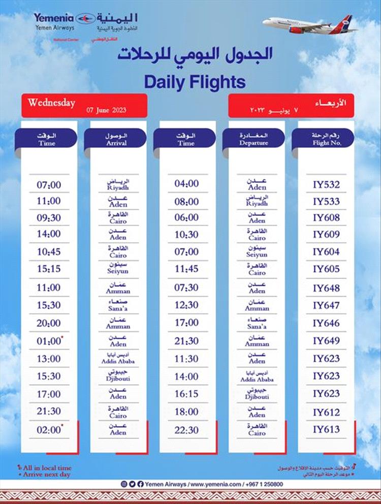 جدول مواعيد اقلاع رحلات طيران اليمنية ليوم غد الاربعاء كالتالي: