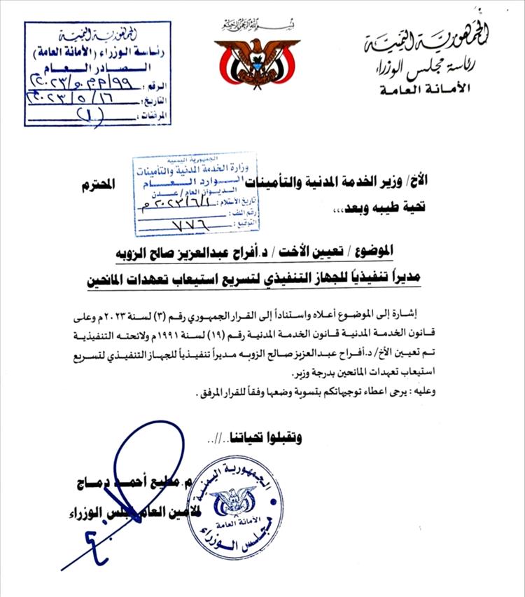 ووجه الأمين العام لمجلس الوزراء م.مطيع احمد دماج خطابا رسميا لوزير الخدمة المدنية والتأمينات بشأن قرار تعيين أفراح عبدالعزيز صالح الزوبة وإعطاء توجيهات بتسوية وضعها وفقا للقرار.