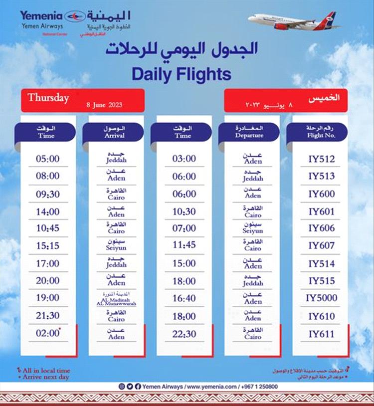 جدول مواعيد اقلاع رحلات طيران اليمنية ليوم غد الخميس كالتالي:
