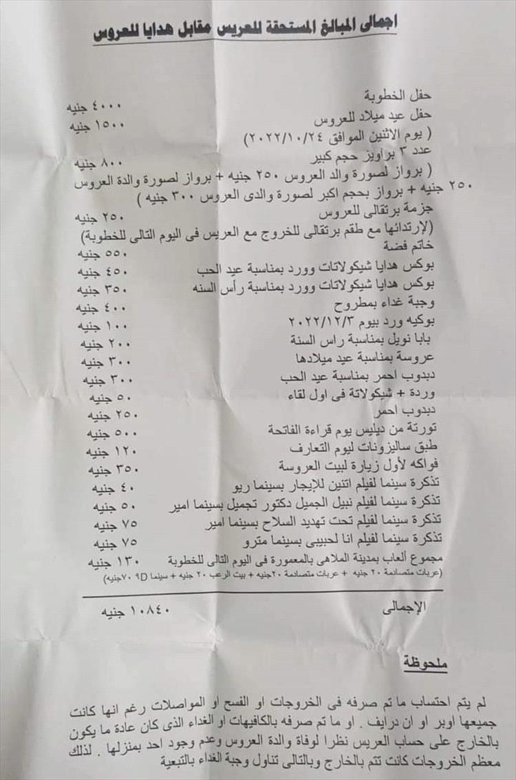 أثارت صورة تم تداولها على موقع التواصل الاجتماعي فيس بوك، جدلًا كبيرًا خاصة بعدما قيل إنها كشف حساب لمصروفات فترة الخطوبة من شاب يطالب بها خطيبته بعد قرارها بفسخ الخطوبة.