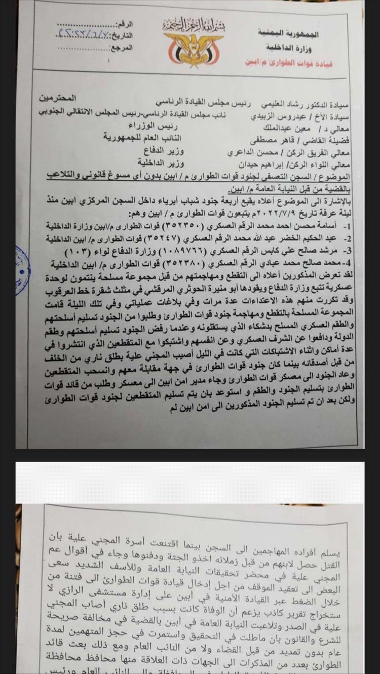 أصدر قائد قوات الطوارئ في محافظة أبين بلاغ صحفي حول اعتقال تسعفي بحق أربعة جنود من قواته دون مسوغ قانوني والتلاعب بالقضية من قبل النيابة بمحافظة أبين.
