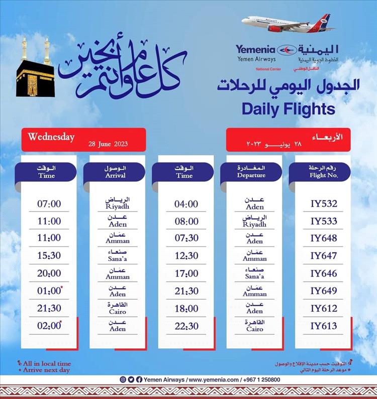 جدول مواعيد اقلاع رحلات طيران اليمنية ليوم غد الاربعاء كالتالي: