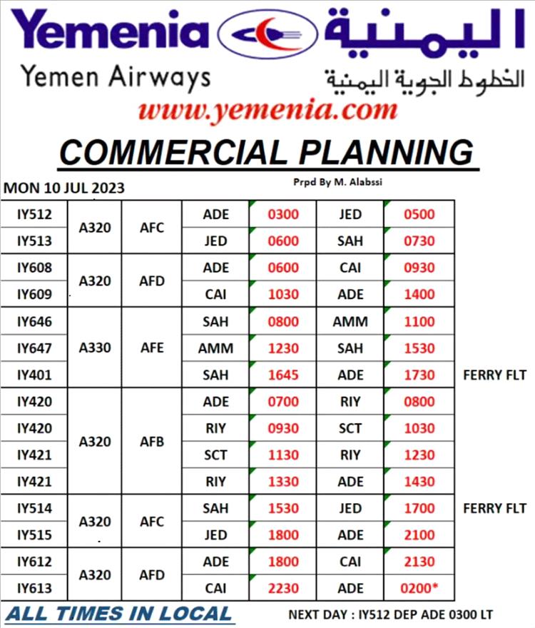 جدول مواعيد اقلاع رحلات طيران اليمنية ليوم غد الاثنين كالتالي: