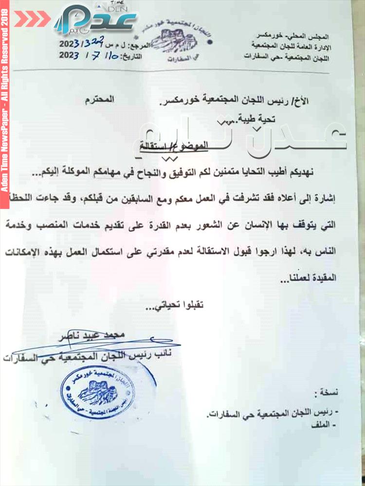 قدم رئيس اللجان المجتمعية بحي السفارات بخورمكسر ونائبه استقالتهما.