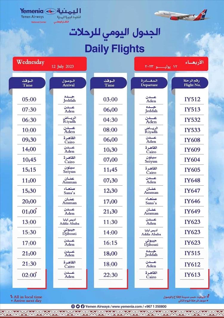 جدول مواعيد اقلاع رحلات طيران اليمنية ليوم غد الاربعاء كالتالي: